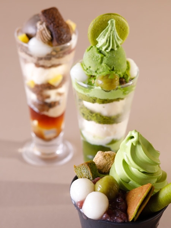 宇治抹茶を使った和スイーツはもちろん、お腹を満たす食事メニュー、おうちで味わうテイクアウトと、さまざまなシーンで楽しんでいただける品をご用意しました。