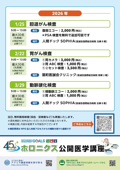 医療法人医誠会(本社:大阪府大阪市、代表者:谷 幸治)は、平日に受診が難しい方のために 「週末検診」を実施しています。1月25日(日)は、医誠会国際総合病院 人間ドックSOPHIAで 先着順・定員30名募集の「胆道がん」腹部エコー検査を受けていただけます。検診費用の一部は、同グループのSDGsを推進するNPO法人未来プロセスの補助により負担を軽減しています。時間の制約や経済的な理由で検診の先送り対策にこの検査の機会を提供しています。