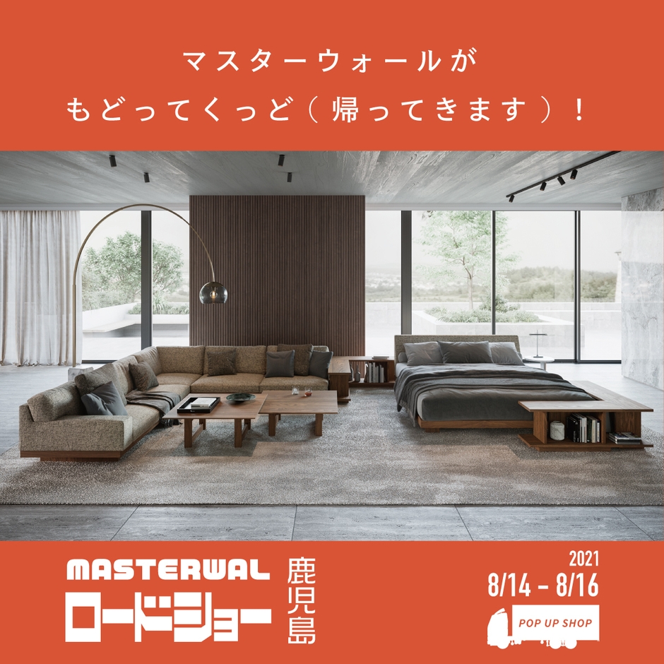 家具ブランド「MASTERWAL(マスターウォール)」( https://www.masterwal.jp/ )を運営するAKASE株式会社(本社:岡山県浅口郡里庄町、代表取締役社長:藤井 幸治)は、2021年8月14日(土)~8月16日(月)の3日間【マスターウォール ロードショー鹿児島】と題して、マスターウォールのPOP UPイベントを、鹿児島県鹿児島市にて開催いたします。当イベントでは、マスターウォールの人気家具の展示販売はもちろん、直営店舗で人気のワークショップやミシン工程の実演を行い、マスターウォールを体感いただける企画をご用意しております。