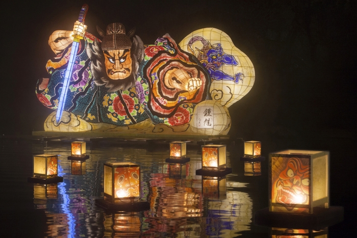 浮湯の周りに浮かべる二つ目の山車は、疫病除けや邪気除けの神として信仰されている鍾馗です。中国の神話で、唐の玄宗皇帝が熱病にかかった際、夢の中で鐘馗という男が小鬼を退治したところ、夢から覚めた玄宗は回復していたと言い伝えられています。皇帝は自分の命を救ってくれた錘馗を神として定め、今に至るまでまつられています。