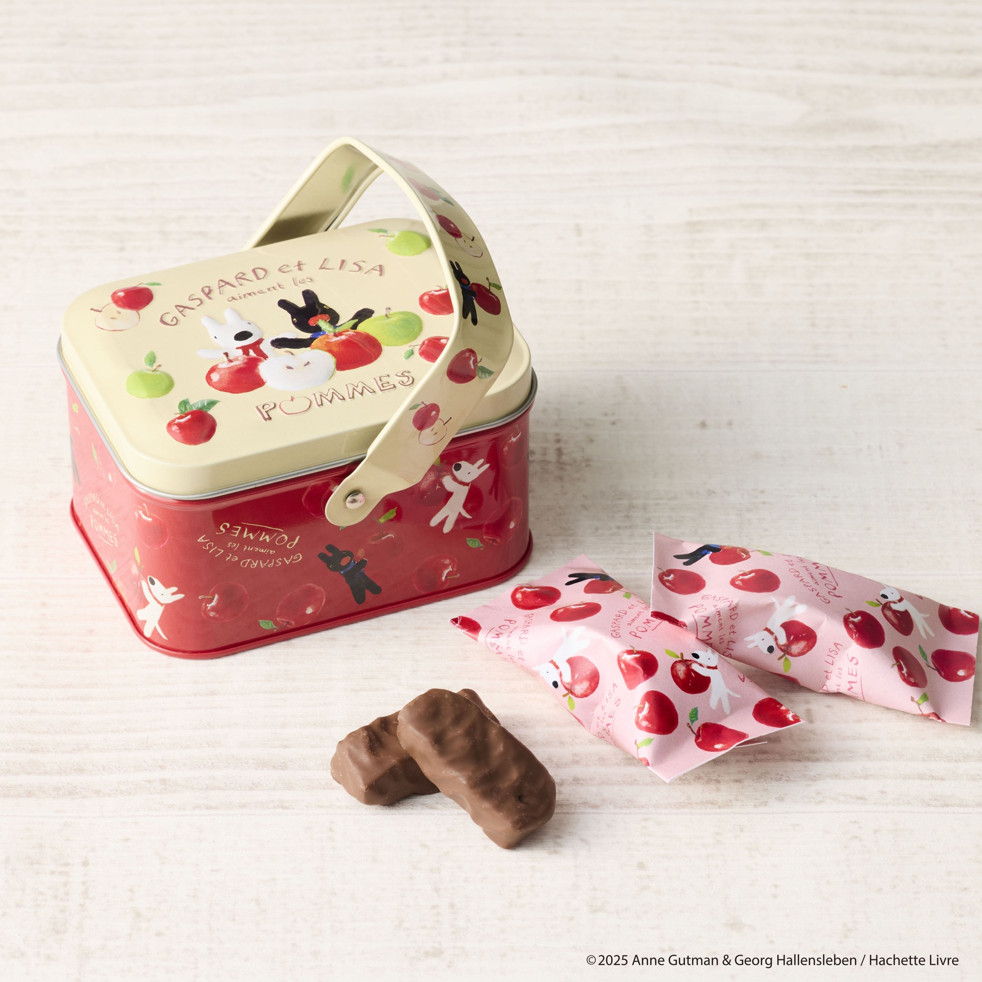 ビターショコラでコーティングした糖漬け林檎を、バスケット型の缶に詰め合わせました。
