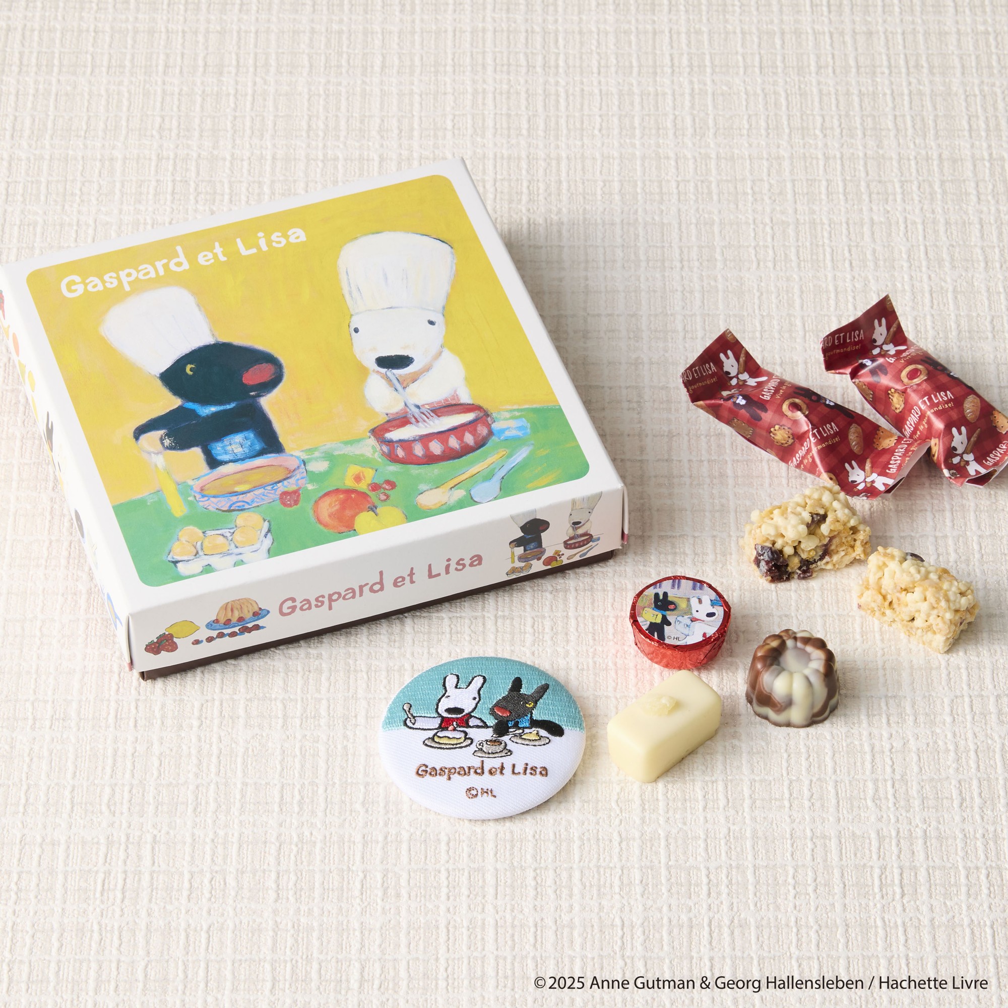 お菓子作りを楽しむリサとガスパールが描かれたパッケージに、ボンボンショコラやクランチショコラを詰め合わせました。
