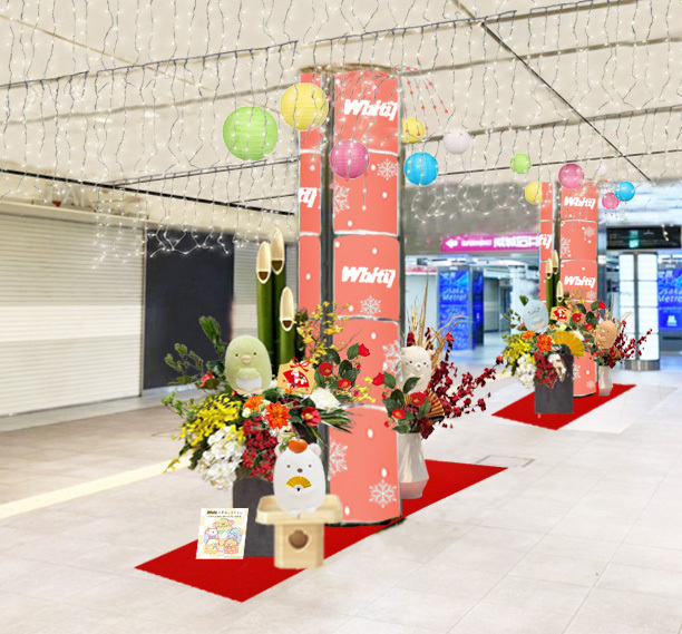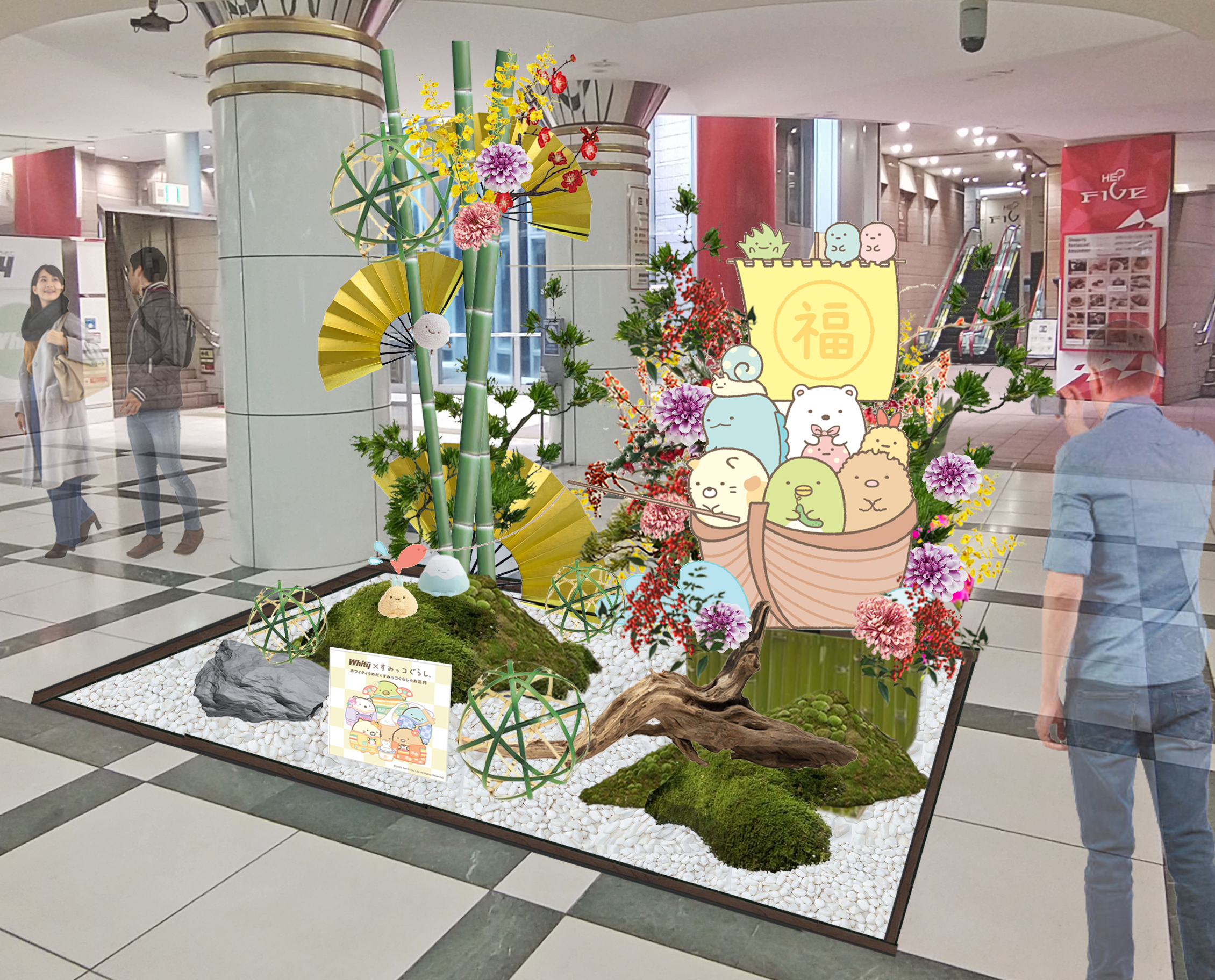 クリスマス装飾後も、お正月ビジュアルすみっコたちと華やかな松やお花が空間を彩るお正月装飾を実施します。