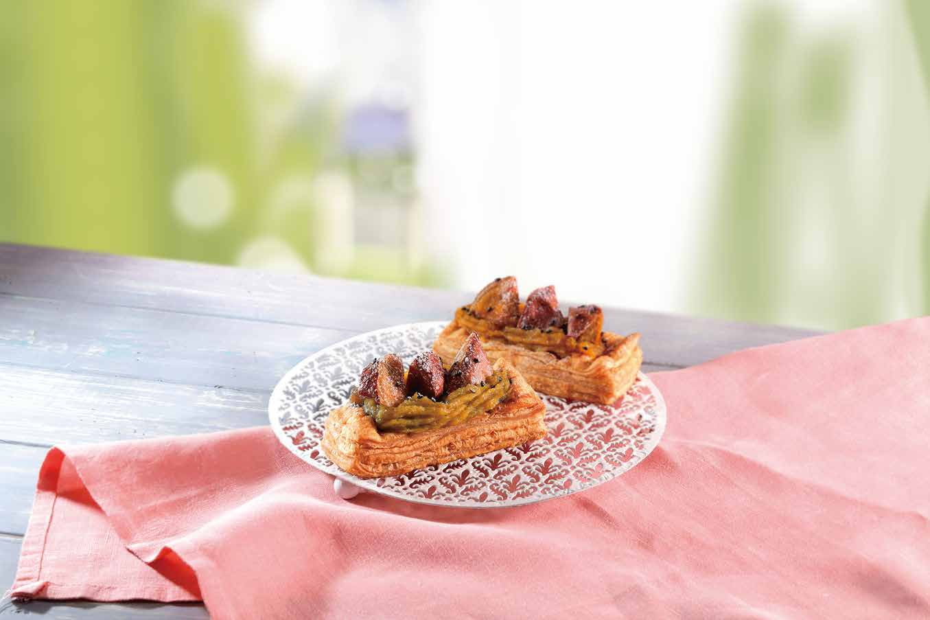 蜜のようにとろける安納芋の香ばしいペーストに甘じょっぱい大学芋を重ね、香りと食感が調和したパイ。