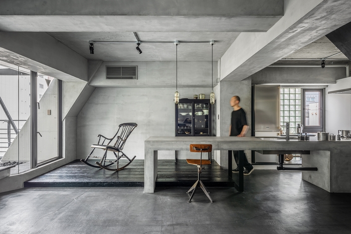 塗膜防水下地に墨入りモルタルを施工した真っ黒な土足づかいの床。光の表情が見えるよう躯体上にモルタル仕上げのグレーの壁天井。エッジのきいたデザインの海外製品に、作家物やアンティーク品といった1点ものの家具や建具が配された室内。美しいものに囲まれる時間を慈しむように暮らしています。