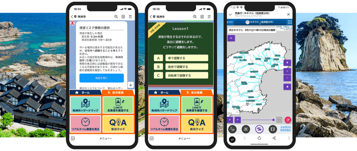 ・防災学習機能・・・自然災害のリスクや事前の準備、災害発生時の避難行動などをクイズ形式で学習