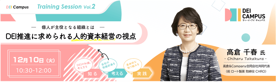 ロート製薬元CHRO 髙倉 千春氏登壇! 「~個人が主役となる組織とは~ DEI推進に求められる人的資本経営の視点」 12月10日(火)開催(参加無料)