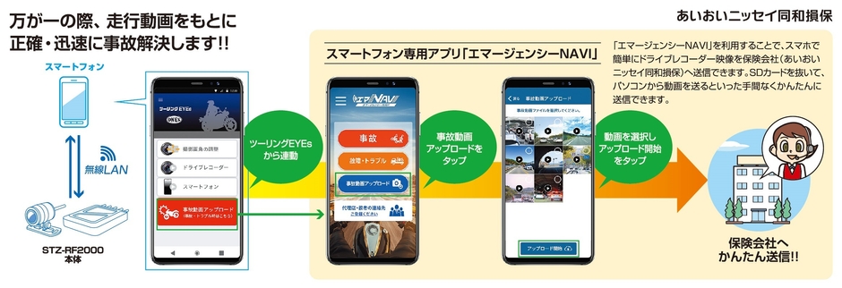 また、あいおいニッセイ同和損保への事故映像の送信を可能とする「エマージェンシーNAVI」と、当ドライブレコーダーで撮影した走行映像のスマートフォン上での閲覧はもちろん、ツーリング時の動画等を手軽にSNSに投稿できる「ツーリングEYEs」の2つの専用スマートフォンアプリもあわせて開発しました。