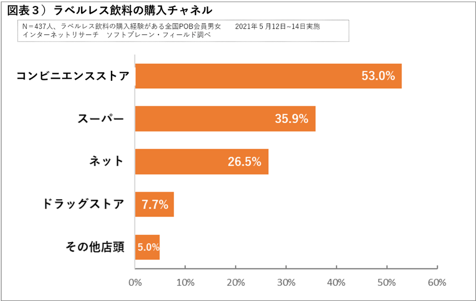 次に、ラベルレス飲料の購入チャネルを尋ねると(N=437人、ラベルレス飲料の購入経験がある人:複数回答)、半数以上が「コンビニエンスストア(53.0%)」と回答し、「スーパー(35.9%)」、「ネット(26.5%)」、「ドラッグストア(7.7%)」が続きました。