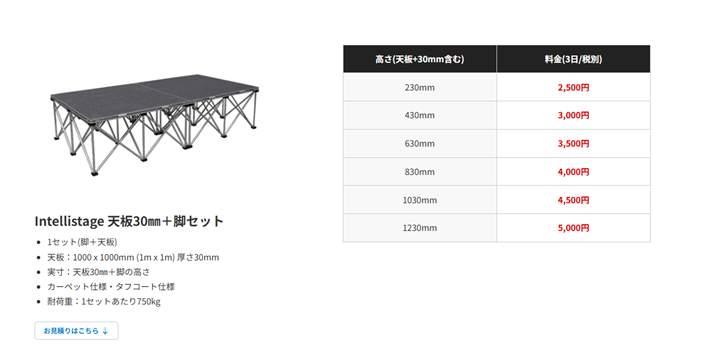 特にレンタルステージに関しては安価で1台からレンタル可能、施工まで対応と事業者のニーズに合わせた発注が可能となっています。