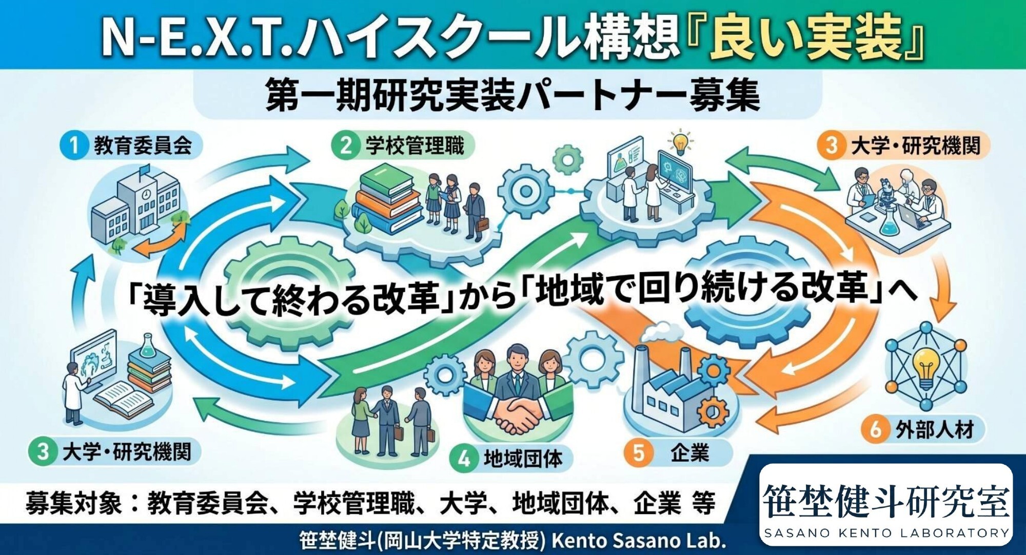 笹埜健斗(岡山大学特定教授)は、N-E.X.T.ハイスクール構想を「導入して終わる改革」ではなく「地域で回り続ける改革」として具体化するため、都道府県教育委員会・学校管理職・大学・研究機関・地域団体・企業等を対象に、「良い実装」第一期研究実装パートナーの募集を2026年4月28日(火)に開始します。