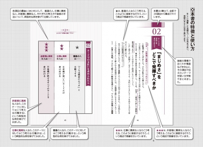 本書では、接客の現場で出くわす場面などを中心に、どう対応したらいいのか悩みがちなテーマを38項目ピックアップ。