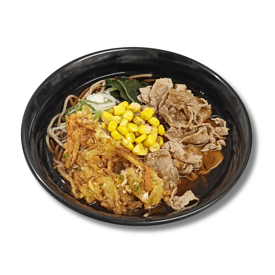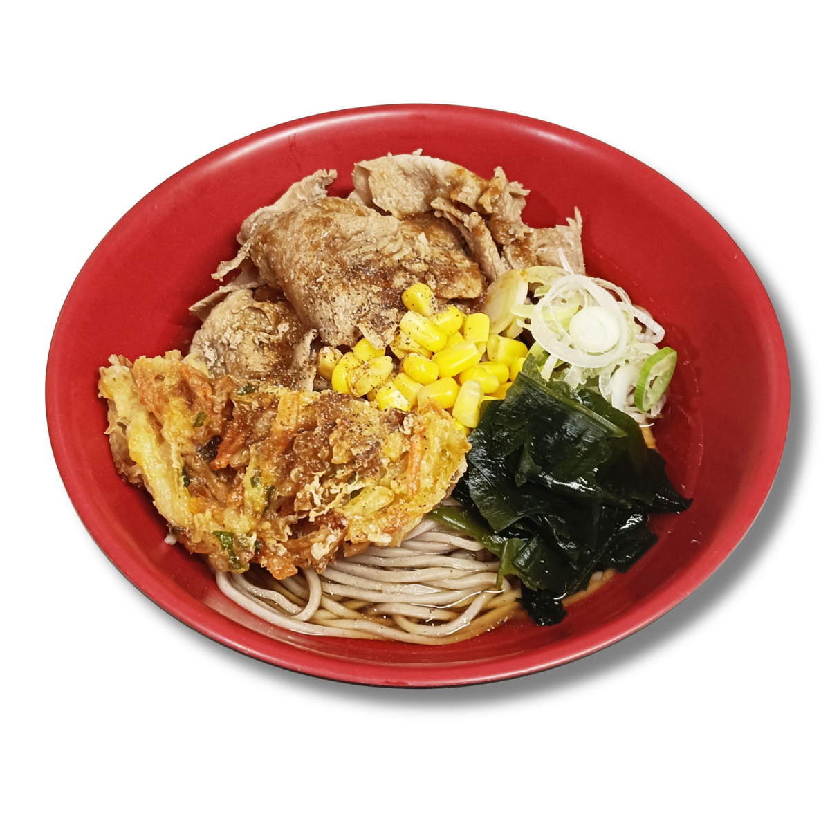 商品特徴:ステーキソースを絡めた豚肉をのせ、さらに追いステーキソースとブラックペッパーで仕上げた、ステーキ感満載のおそばです。