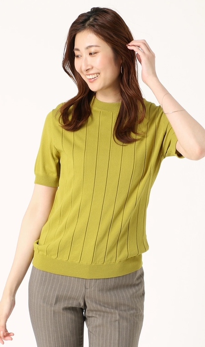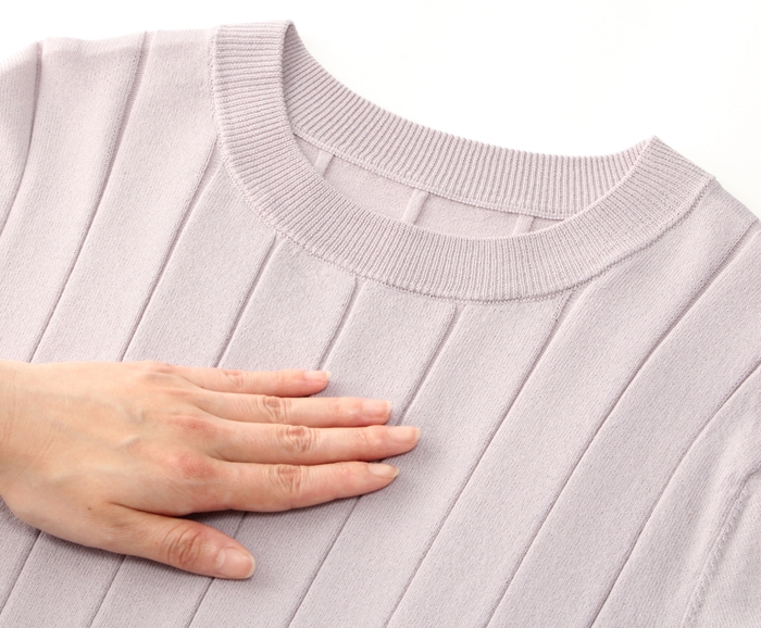 今回発売する涼感ニットは接触冷感生地によるひんやりとした肌触りが特徴。また、通気性と吸湿性があり蒸れにくいレーヨン素材を混紡し、編み方の工夫で生地にシャリ感を出すことで肌離れを良くし、汗によるべたつきを軽減します。デザインは胸元の開きを抑えたクルーネック仕様。落ち着いた雰囲気で顔回りに視線が集まりやすいリモート会議にも使いやすい他、二の腕をしっかりカバーする5分袖が安心感を与えます。また、全体的に太めのリブ編みを採用した一方で、襟・袖口・裾は細めのリブ編みに切り替えることでデザインにメリハリをつけています。商品は家庭の洗濯機で丸洗いが可能で、紫外線の透過を防ぐUVカットを備えています。カラーはベーシックで使いやすいグレー色に加えて、上品で大人っぽい印象の“鶸色(ひわいろ)”を用意しました。