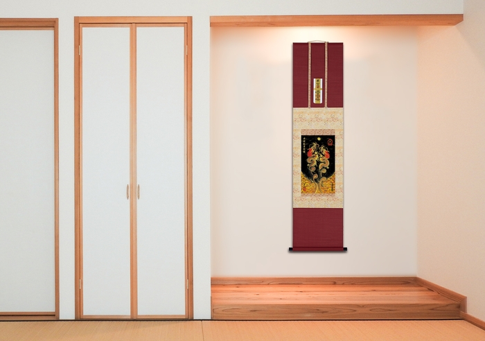 古代より家内礼拝用として伝わる掛軸に御札(紙製)をお祀りした、日本伝統の本格的表装加工の掛軸御守
