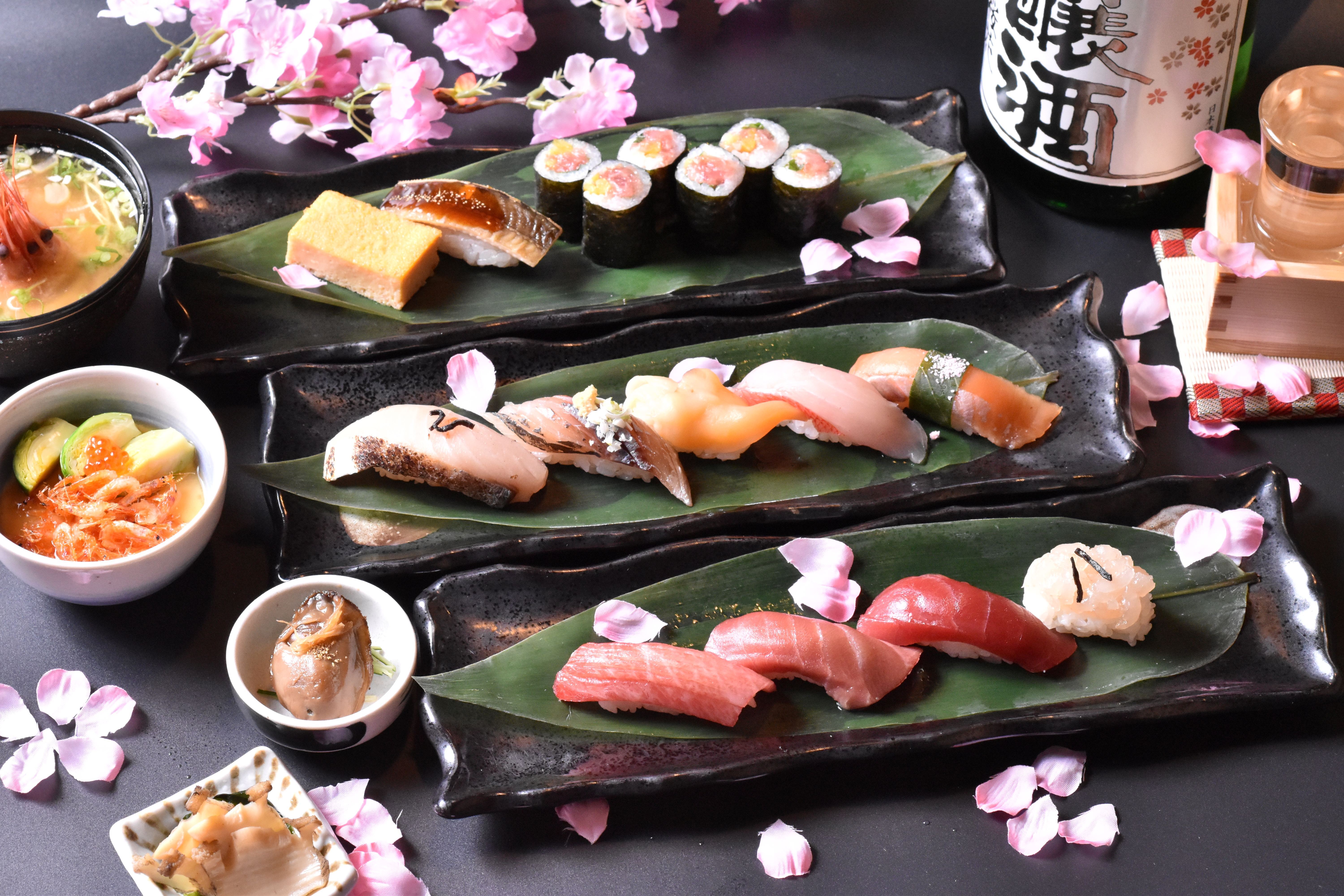 春の訪れを五感で楽しむ、華やかな寿司と日本酒のセットです。
