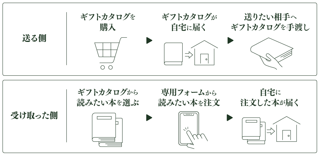 20冊の中から好きな1冊を選べる“本のギフトカタログ”です。贈り手がカタログを渡し、受け手が専用サイトから本を選ぶ仕組みで、「1冊・2冊・4冊プラン」を用途に応じて展開しています。