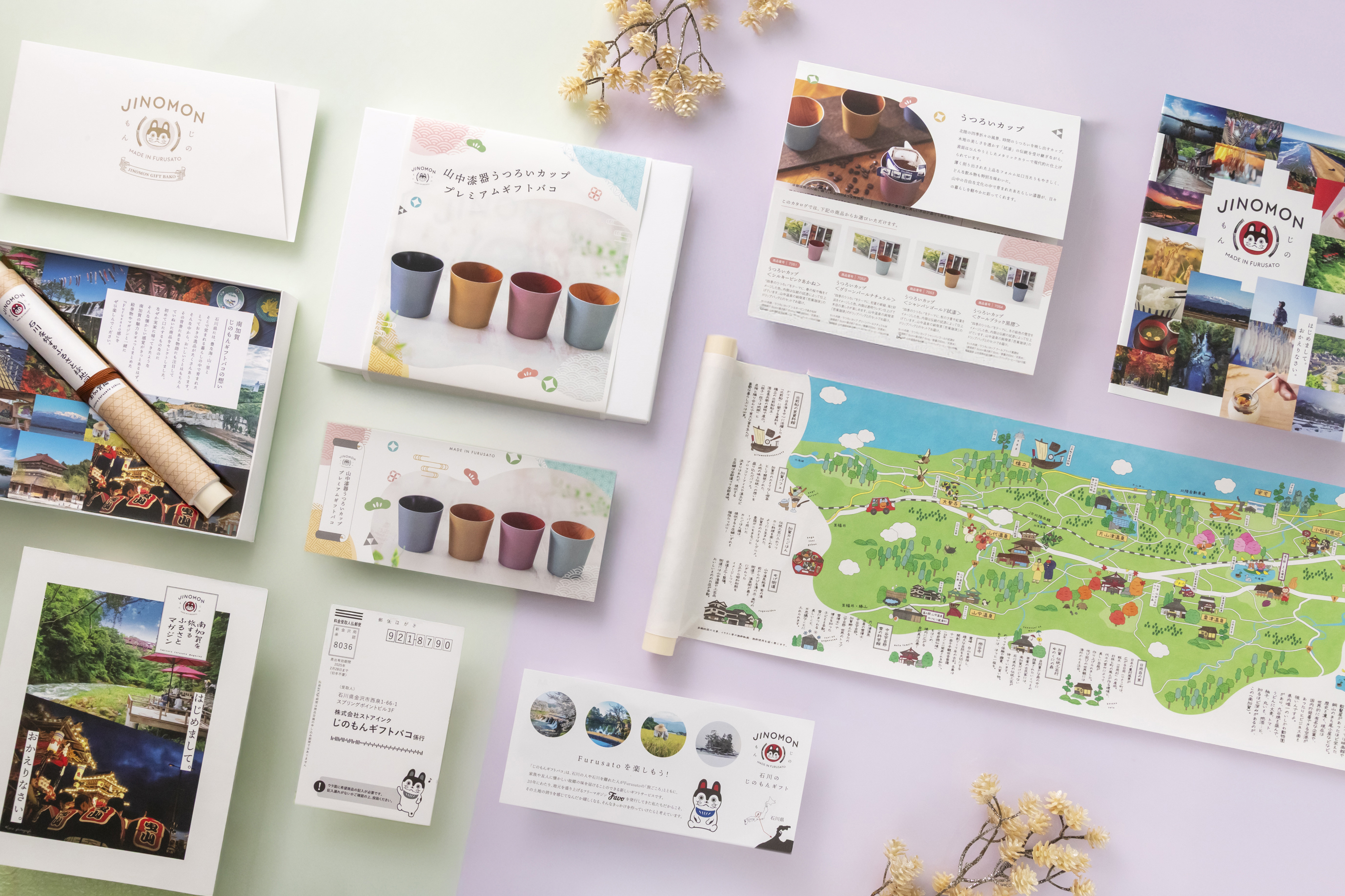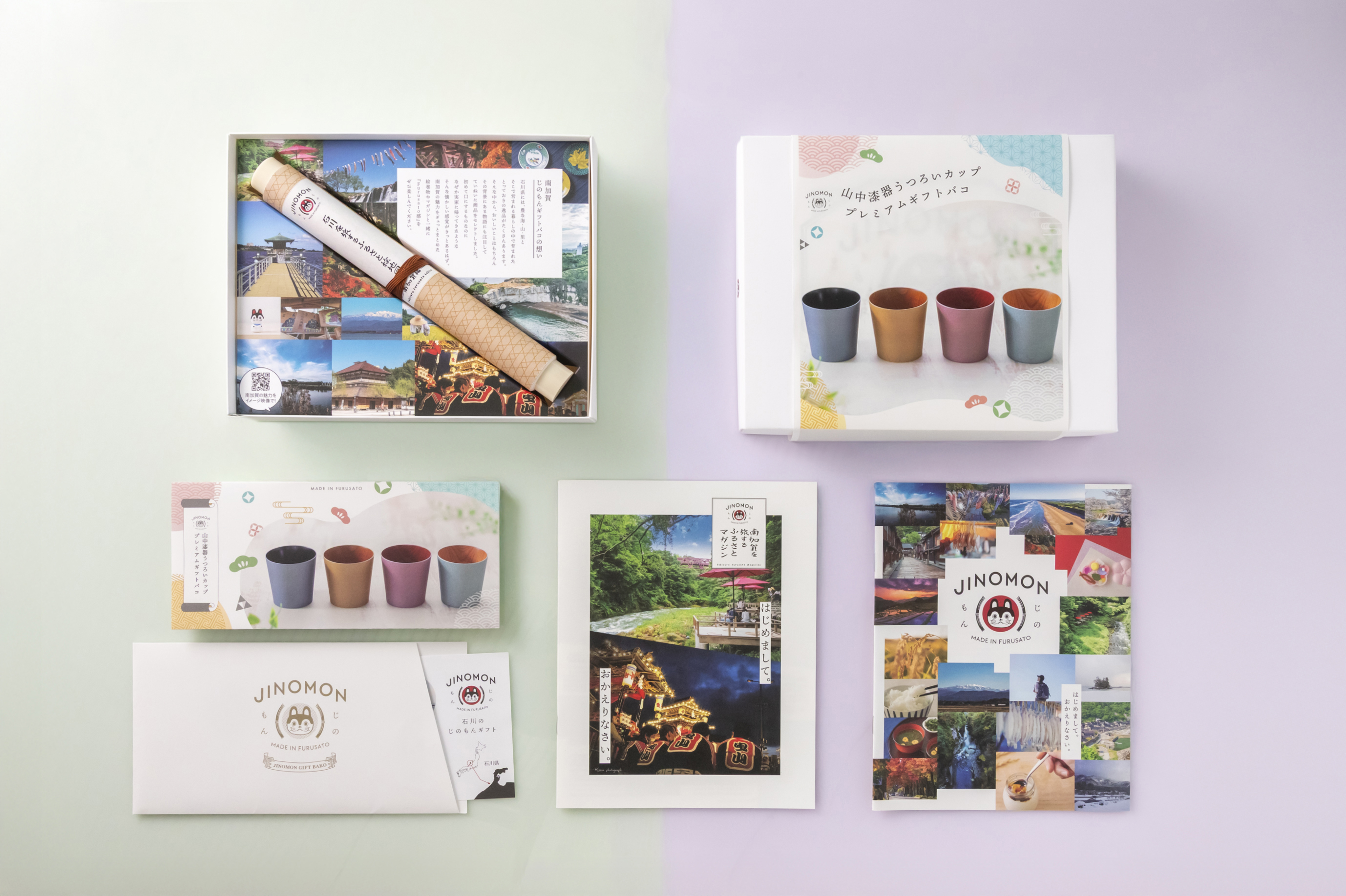A4サイズより一回り小さな箱に収められたギフトバコには、「うつろいカップカタログ」と「旅するふるさと絵巻物(南加賀編)」や「旅するふるさとマガジン(石川版・南加賀版)」を同梱。おうちで石川や南加賀へのプチトリップを楽しめる、ユニークな仕掛けの“ツウな南加賀発見”カタログギフトとなっています。