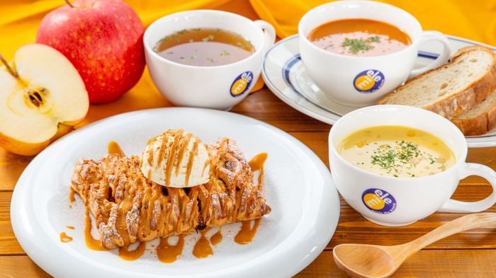 2Fカフェでは、こっくりと濃厚な淡路島産牛乳とコーンの甘みが優しく広がる「コーンチャウダー」、海老の香りとコクを味わう「ビスク」、甘みある淡路島産玉ねぎを贅沢に味わえる「オニオンスープ」の3種のスープを提供。さらに、淡路島産の藻塩を使ったキャラメルソースとシナモンをアクセントにした「アップルパイ」や、アールグレイフレーバーのヨーグルトアイスと焼きリンゴを楽しめる冬のヨーグルトアイスボウル「アールグレイ&焼きリンゴ」もお楽しみいただけます。