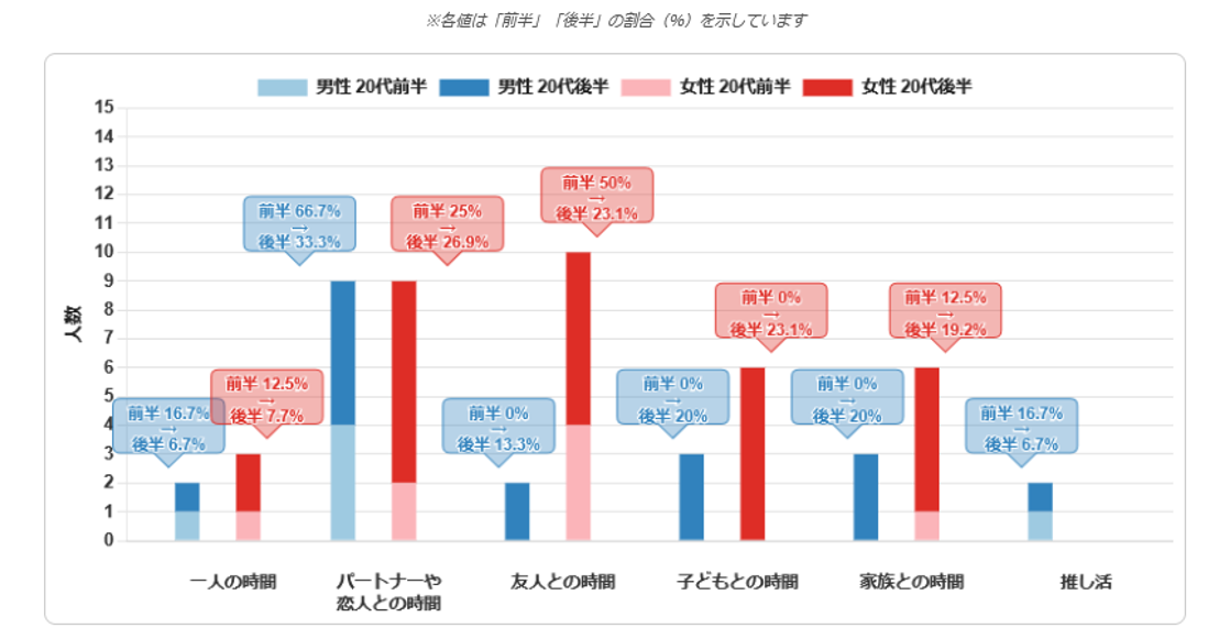 さらにZ世代にとっての「しあわせな時間」の「お相手」を深掘りすると、男性は20代前半から「パートナー」との回答が多く、女性は20代前半では「友人」が多数ですが20代後半で「パートナー」との回答割合が増加しています。また男女ともに20代後半にかけては「子供」との時間にしあわせを感じるとの回答が増えており、ライフステージに応じた「大切なひと」との時間に「しあわせ」を感じていることが見受けられました。