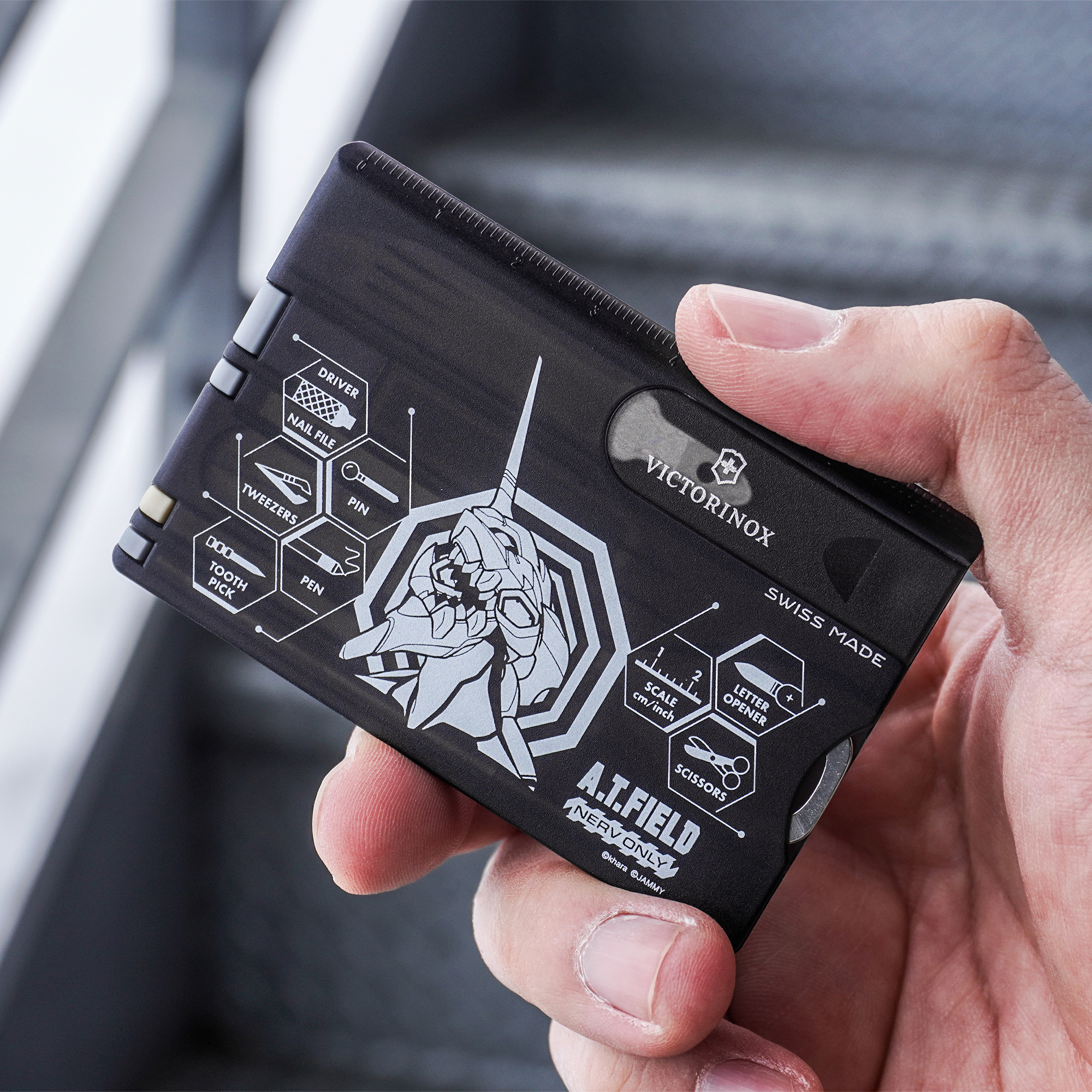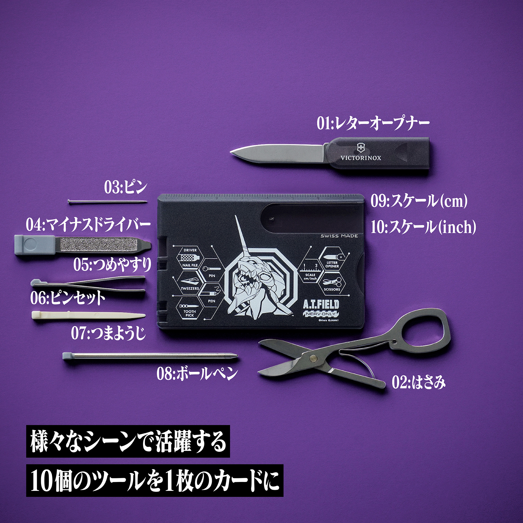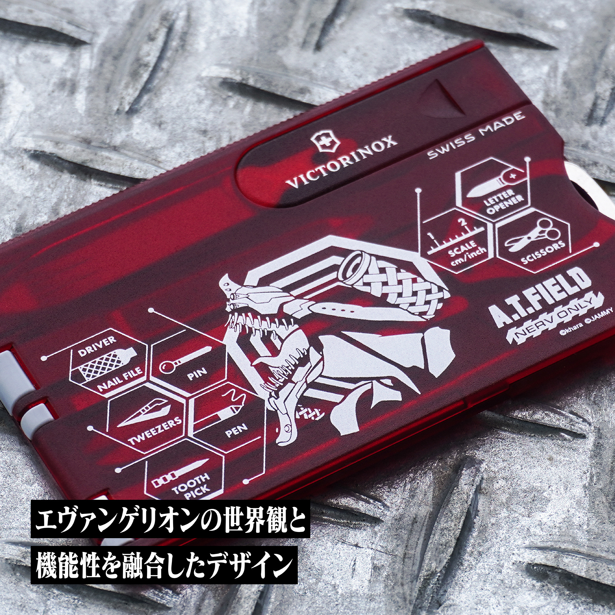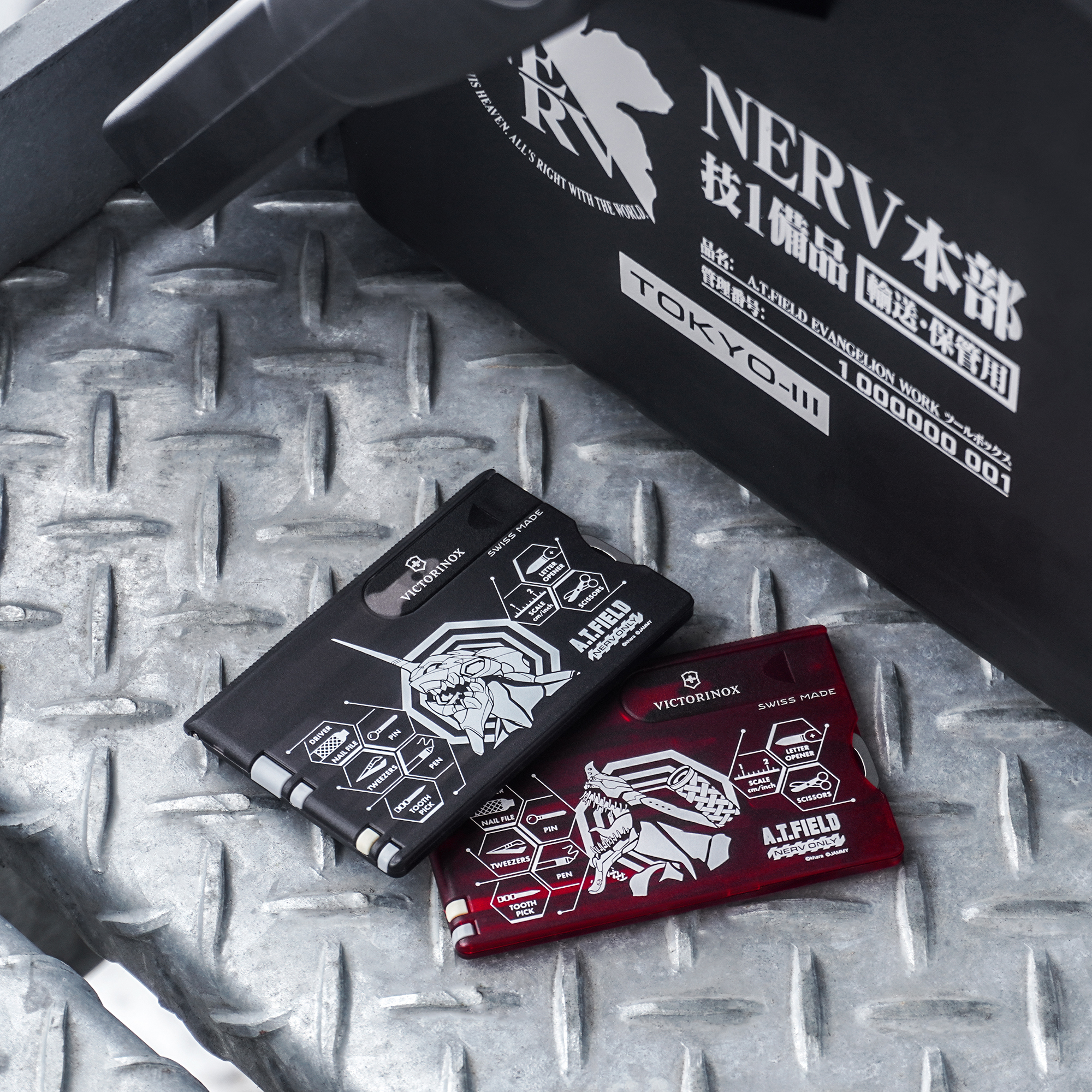 エヴァンゲリオンのワークブランド「A.T.FIELD EVANGELION WORK」と、1884年スイスでナイフメーカーとして創業以来、高品質・高機能なマルチツールを製造し続ける「VICTORINOX(ビクトリノックス)」の代表的なアイテムの1つ「スイスカード」のコラボレーションモデルです。