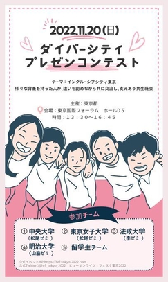 明治大学国際日本学部の山脇啓造ゼミナール(専門:多文化共生論)と中央大学、東京女子大学、法政大学、留学生チームの大学生5チームが参加する「ダイバーシティ・プレゼンコンテスト」が、11月20日(日)に東京国際フォーラムで実施されます。東京都が主催する「ヒューマンライツ・フェスタ東京2022」の一環として、上記5チームの企画・運営によって開催されます。当日は、様々な背景や価値観を持つ人が、違いを認め合いながら共に交流し、支え合う共生社会「インクルーシブシティ東京」を実現するために効果的な取り組みについて、上記の5チームがプレゼンを行います。