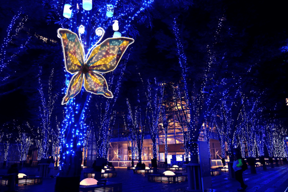 青く輝く蝶が導く、祝福と感謝の青いイルミネーション
