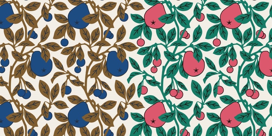 2種の果実をカラフルに描いた「ペアーズ&チェリーズ」は、1880年ごろデザインされた内装用テキスタイルをアレンジしています。原図はシンプルなラインが特徴的で、それを美しく生き生きとしたパターンに仕上げました。