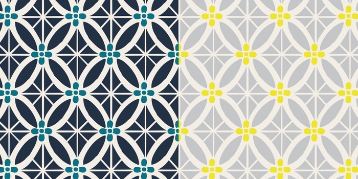 連続する幾何学柄が印象的な「フローラルタイル」は、19世紀後半の壁紙やテキスタイルに使われたデザインをアレンジし、涼しげな色合いに仕上げました。