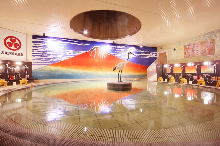 壁面の赤富士や浴槽中央の鶴のオブジェが昭和レトロを感じさせる「大江戸赤富士風呂」や、檜やぐらや太鼓橋が和の情緒たっぷりの「大江戸百人風呂」も見どころです。