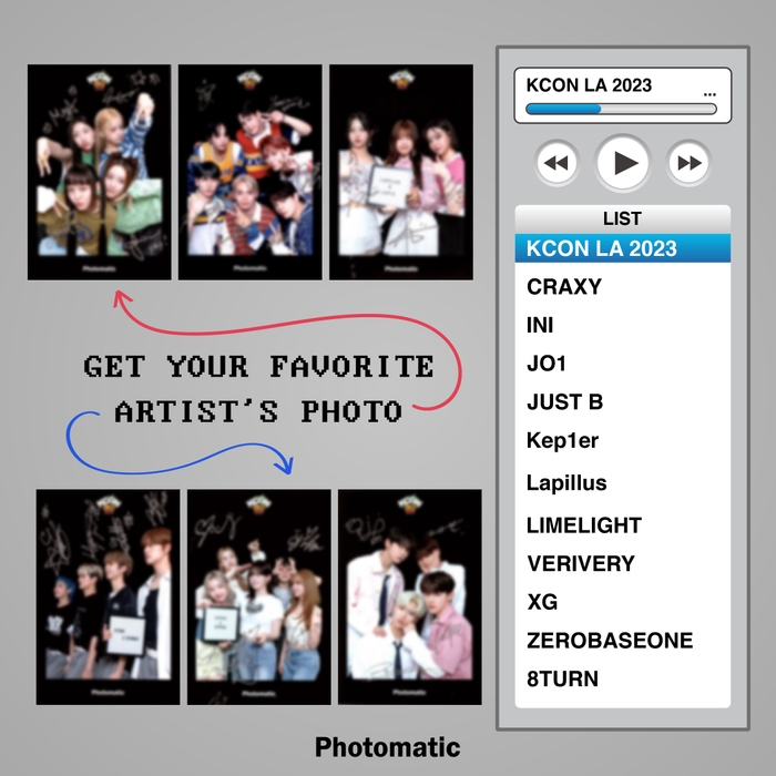 会場内では、KCON LA 2023に出演したアーティストのライブ映像やPhotomaticオリジナルの写真をご覧いただけるので、待ち時間にもお楽しみいただけます。