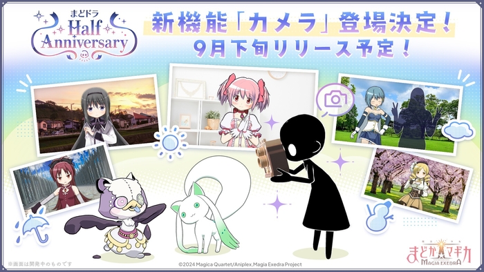 まもなく迎えるハーフアニバーサリーに向けて、ハーフアニバーサリー記念の新機能「カメラ」を2025年9月下旬にリリースすることを決定いたしました。新機能「カメラ」は、所持しているキオクから好きな魔法少女を選び、一緒に「おでかけ」して撮影できる新機能となります。