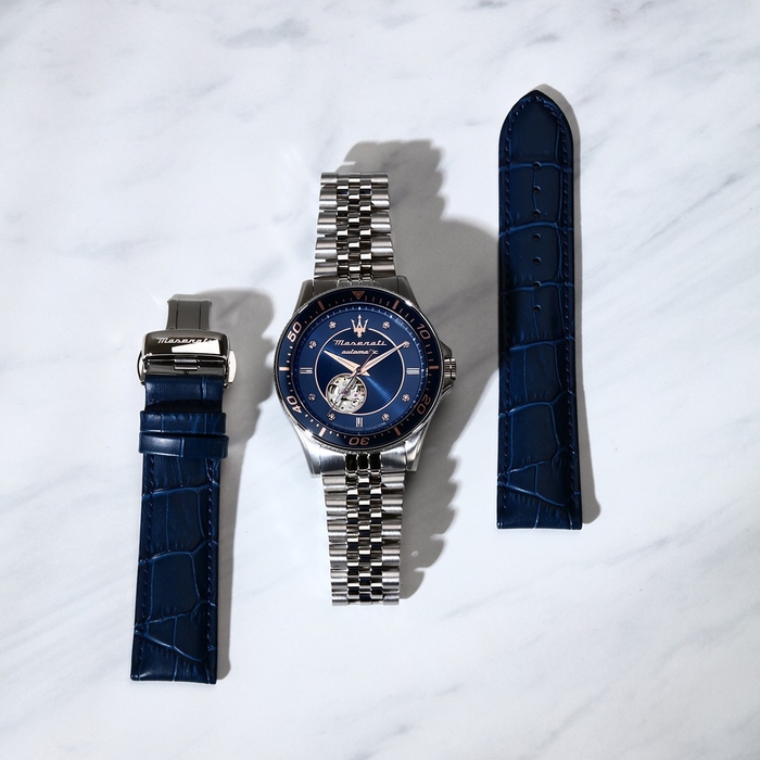 登場するのは、澄み渡る空をテーマにした「Cielo(チェロ)」、スピードとエレガンスを融合した「Velocità(ベロチタ)」、機械式の鼓動を可視化した「Sfida Open Heart(スフィーダオープンハート)」の3モデル。それぞれが異なる世界観を持ちながら、ブランドの象徴であるトライデントを文字盤に宿し、マセラティらしいスタイル・技術・情熱を凝縮しています。