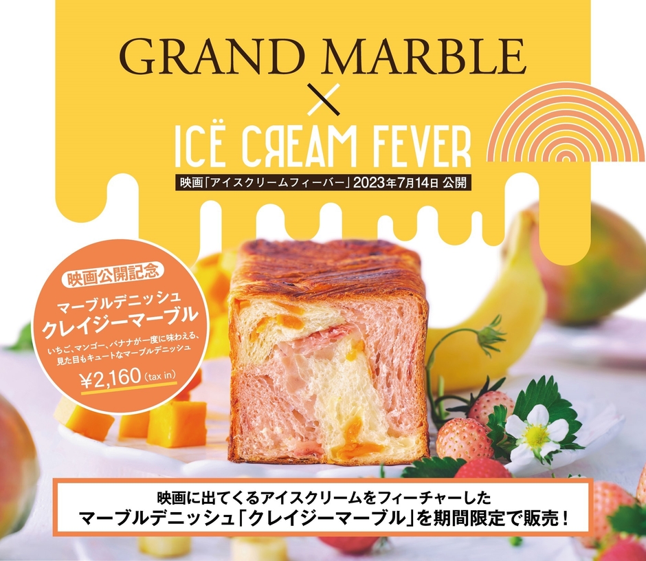 京都発祥マーブルデニッシュ専門店、株式会社グランマーブル(本社:京都市南区上鳥羽北島田町93番、代表取締役:山本正典)は、当社初のプロデュース作品として映画『アイスクリームフィーバー』をこの夏公開。映画とコラボしたマーブルデニッシュ「クレイジーマーブル」を2023年4月28日(金)に期間限定で発売いたします。同日より、プレゼントキャンペーンも実施。是非ホームページでチェックしてください。