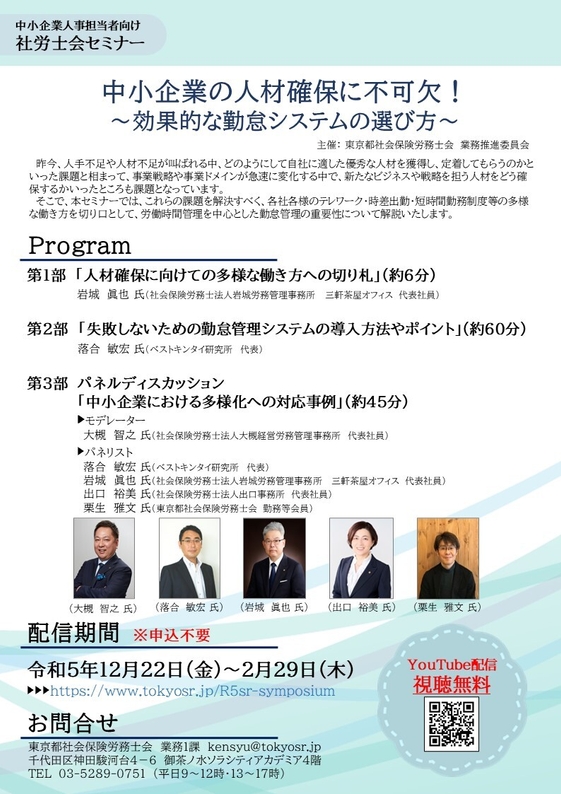 東京都社会保険労務士会(会長:寺田 晃)は、中小企業人事担当者向け社労士会セミナー「中小企業の人材確保に不可欠!~効果的な勤怠システムの選び方~」をYouTubeにて期間限定で配信いたします。