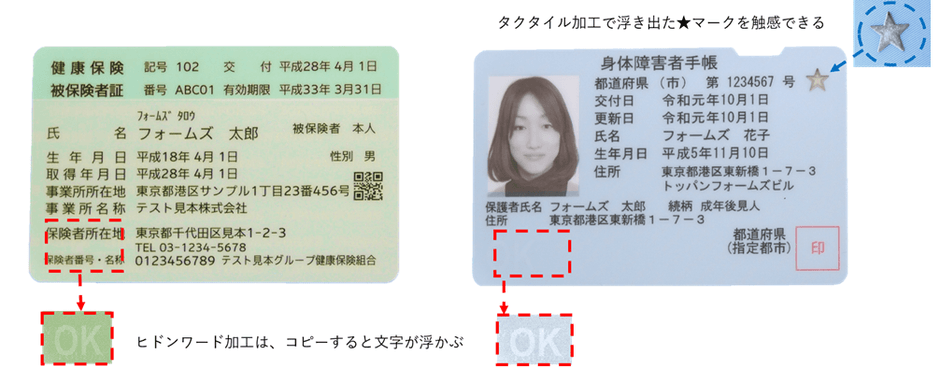今回の偽造防止技術を採用した健康保険証のサンプル(左)とカード様式障害者手帳(右)