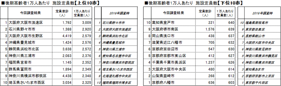 ~ビッグデータで見る 「全国970市区部 高齢者1万人あたりの施設定員数」~ 上位の大阪市浪速区、石川県野々市市は3年前と変わらず 下位10市区は大きく変動し、最下位は京都府八幡市