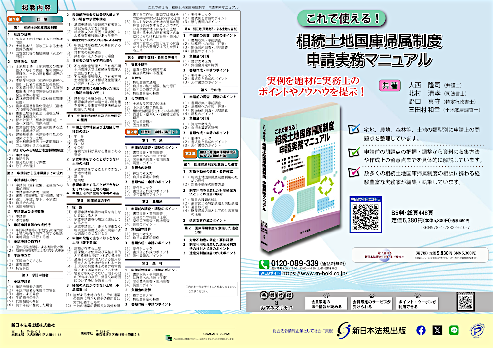 新日本法規出版株式会社(所在地:愛知県名古屋市中区、代表取締役社長:河合誠一郎)は、新刊『これで使える!相続土地国庫帰属制度 申請実務マニュアル』を2026年2月24日(火)に発売いたしました!