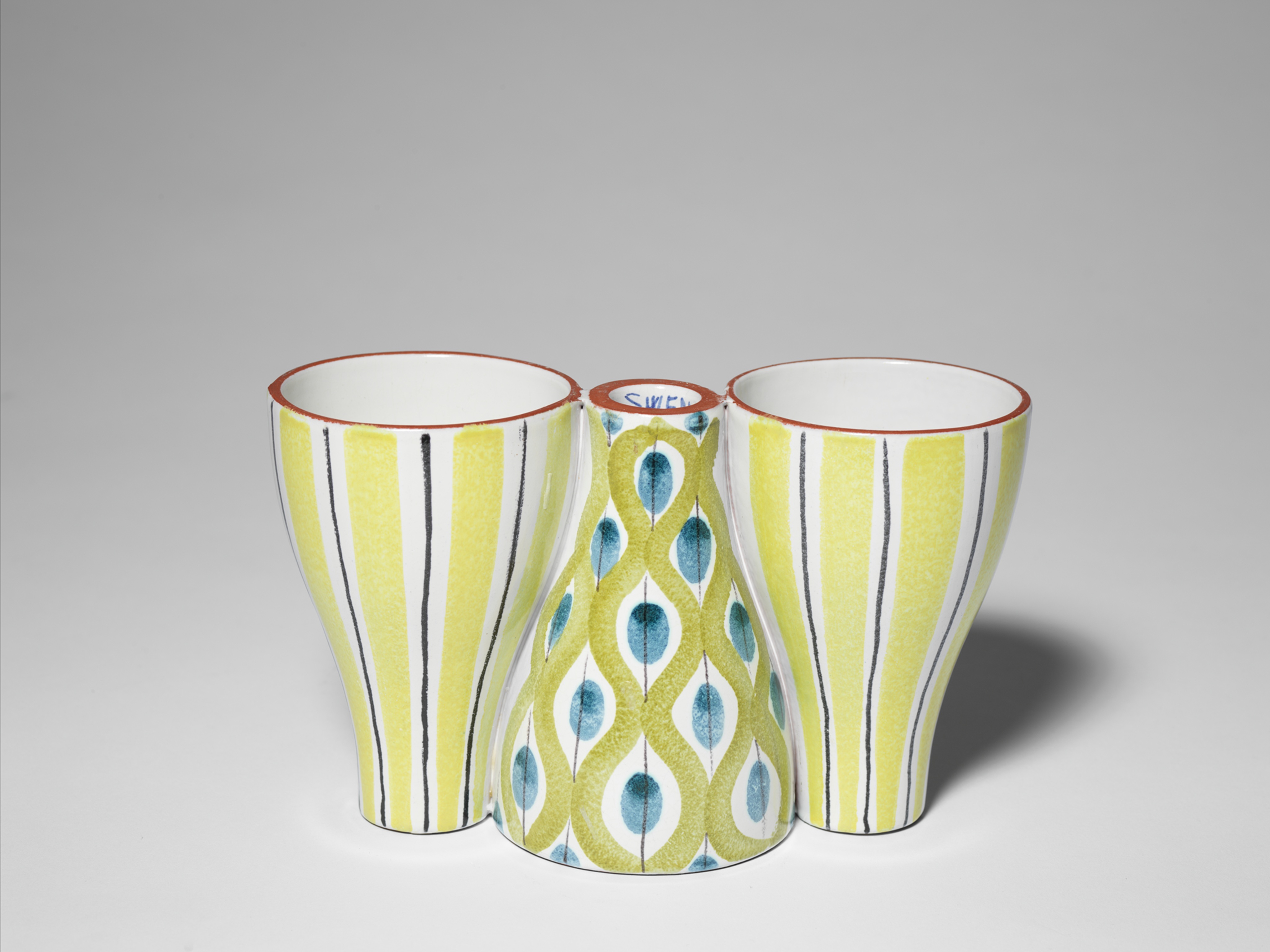 1940年代にリンドベリは、ファイアンスで遊び心のある模様や明るい色遣いの器で人気を博し、またテキスタイルのデザインを始めました。1955年のヘルシンボリ博覧会では、調理した料理を器のまま「オーブンから直接、食卓へ」というアイデアの耐熱食器[テルマ]シリーズと組み合わせて使う[スピーサ・リッブ]を発表。[ベルサ]シリーズは瞬く間に陶磁器メーカーのグスタフスベリのベストセラーとなり、1960年代には多くのスウェーデン家庭で使われるようになりました。
