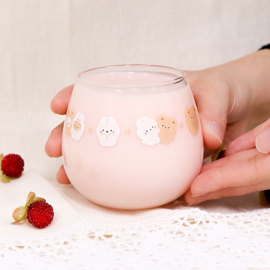 飲み物を注ぐと、グラスやふちに描かれたパムとタルトがやさしく揺れるので、お子さまから大人まで、見ているだけで和む、楽しいグラスに仕上がりました♪