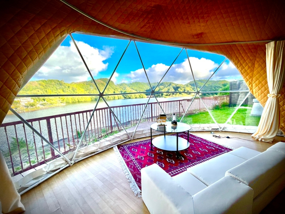 神秘の湖、亀山湖を一望できる場所にグランピングドームを設置、朝は湖畔の静けさ、昼は笹川渓谷からの風に癒され、夜は満天の星空シャワーを全身に浴びる、まさに究極のリラクゼーション環境です。