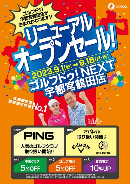 中古ゴルフクラブの買取・販売事業を手掛ける株式会社ゴルフ・ドゥ(本社:埼玉県さいたま市中央区、代表取締役社長:佐久間 功)は、2022年4月に1号店をオープンした新業態「ゴルフドゥ!NEXT」の2号店として、既存店である「ゴルフドゥ!宇都宮鶴田店」(栃木県宇都宮市)にゴルフウェア売場を新設し、「ゴルフドゥ!NEXT宇都宮鶴田店」として、2023年9月1日(金)午前10時00分にリニューアルオープンいたします。