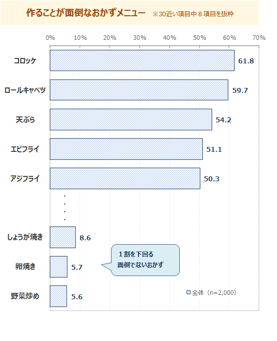 作ることが面倒だと思われているおかずメニューは「コロッケ」が6割強で1位だった。