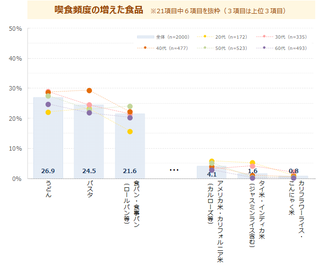 > 米の価格高騰により、「うどん」「パスタ」等の麺類は自宅で食べる機会が増加