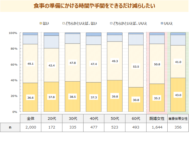 > 女性の8割半が「食事の準備にかける時間や手間をできるだけ減らしたい」