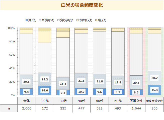 > 20~60代女性の3割が、白米の喫食頻度が「減少」