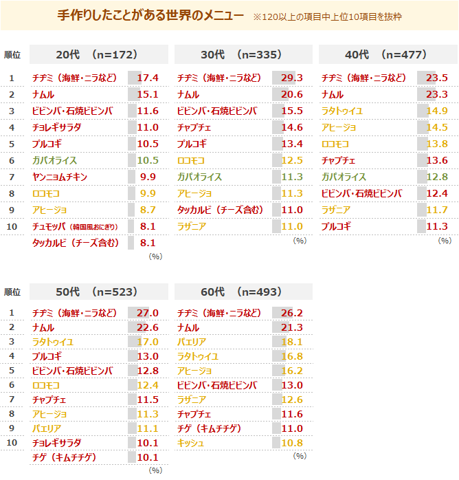 > 手作りしたことがある世界のメニューは「チヂミ」「ナムル」と韓国料理が上位