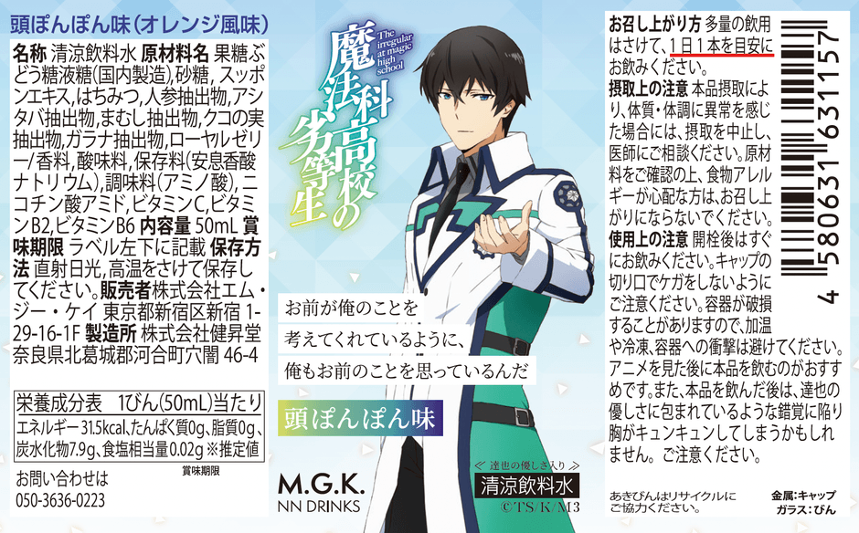「生ホイップは飲み物(R)」の企画・販売を行う、株式会社エム・ジー・ケイ(本社:東京都新宿区、代表取締役:山崎 将史)は、2024年7月17日(水)に、アニメ「魔法科高校の劣等生」の主人公である司波達也に頭をぽんぽんされたらという妄想を形にした「お前が俺のことを考えてくれているように俺もお前のことを思っているんだ 頭ぽんぽん味」(清涼飲料水)を発売いたします。