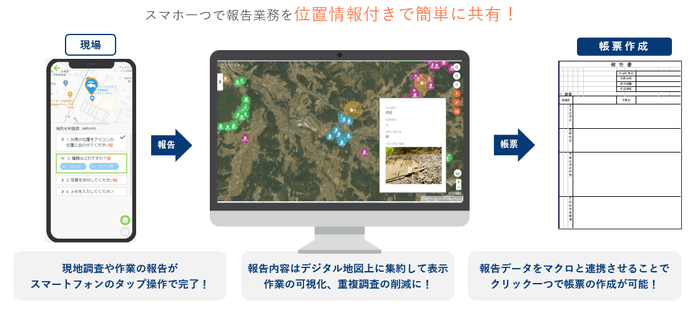 「REPORT&SHARE」はスマートフォンを活用し、様々な被災状況を写真と位置情報つきで地図上に投稿ができ、リアルタイムに情報の報告・共有を可能にしています。登録された情報はキーワードで簡単に検索ができ、帳票作成も簡単なため、復旧作業時の効率化が可能です。