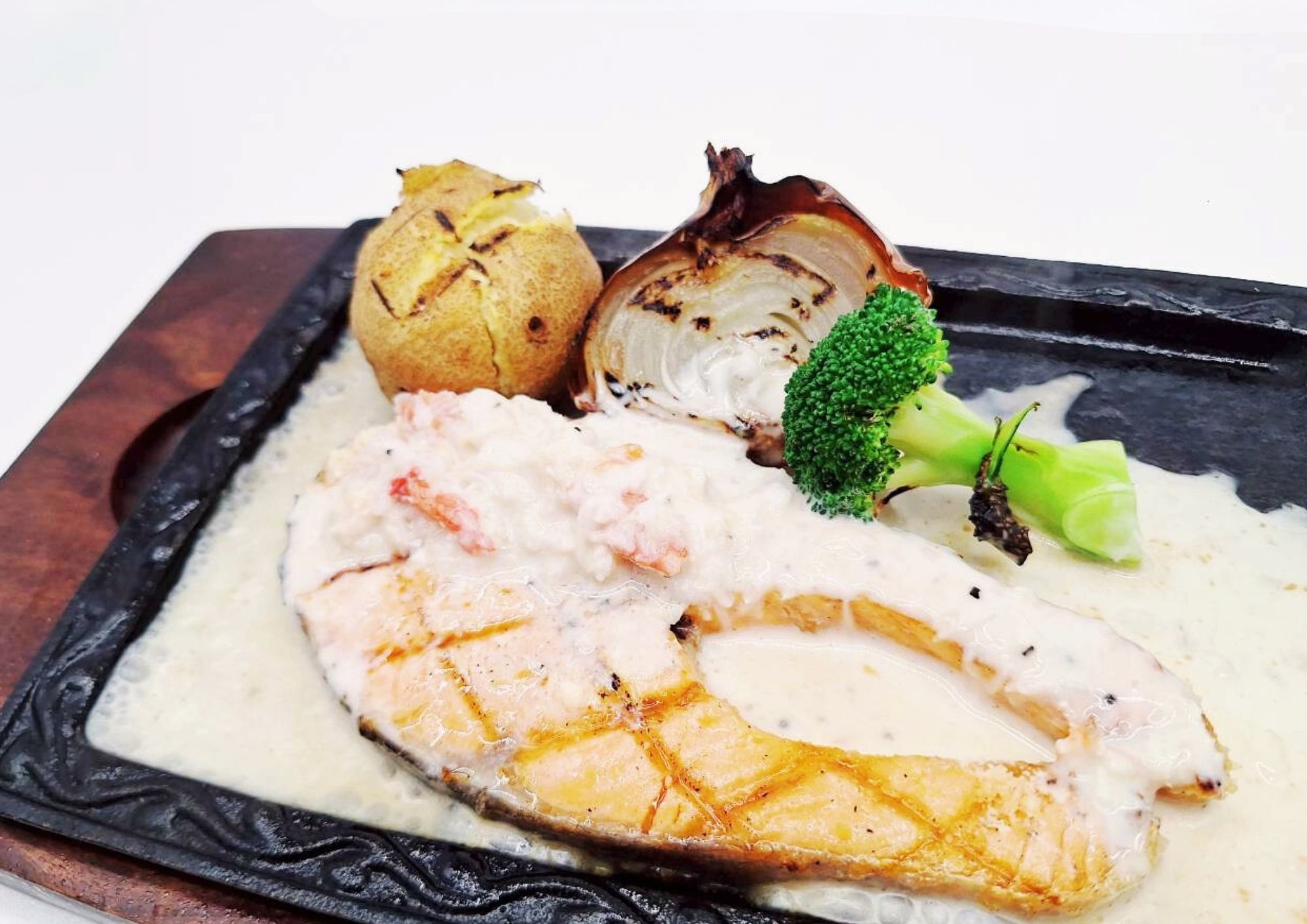 鉄板の上でじゅっと香ばしく焼き上げたサーモンに、蟹クリームと蟹ほぐし身を合わせました。
